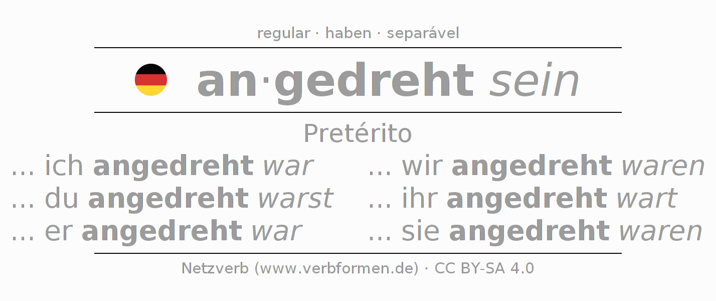 A conjugação do verbo andrehen no Estado passivo Pretérito Indicativo Pretérito é: ... ich angedreht war, ... du angedreht warst, ... er angedreht war, ... wir angedreht waren, ... ihr angedreht wart, ... sie angedreht waren.A formação dessas formas segue determinadas regras gramaticais. Os requisitos para a conjugação do verbo como forma verbal simples no andrehen do Pretérito. Comentários ☆