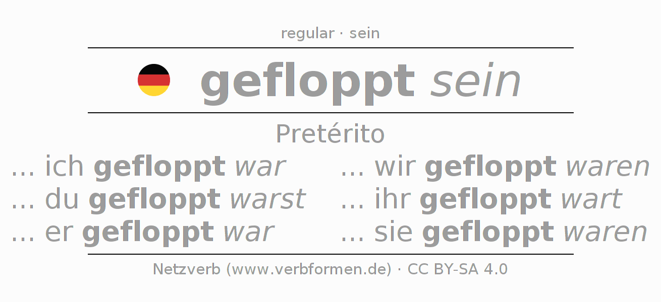 A conjugação do verbo floppen no Estado passivo Pretérito Indicativo Pretérito é: ... ich gefloppt war, ... du gefloppt warst, ... er gefloppt war, ... wir gefloppt waren, ... ihr gefloppt wart, ... sie gefloppt waren.A formação dessas formas segue determinadas regras gramaticais. Os requisitos para a conjugação do verbo como forma verbal simples no floppen do Pretérito. Comentários ☆