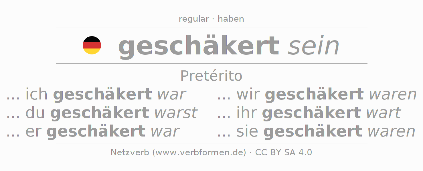 A conjugação do verbo schäkern no Estado passivo Pretérito Indicativo Pretérito é: ... ich geschäkert war, ... du geschäkert warst, ... er geschäkert war, ... wir geschäkert waren, ... ihr geschäkert wart, ... sie geschäkert waren.A formação dessas formas segue determinadas regras gramaticais. Os requisitos para a conjugação do verbo como forma verbal simples no schäkern do Pretérito. Comentários ☆