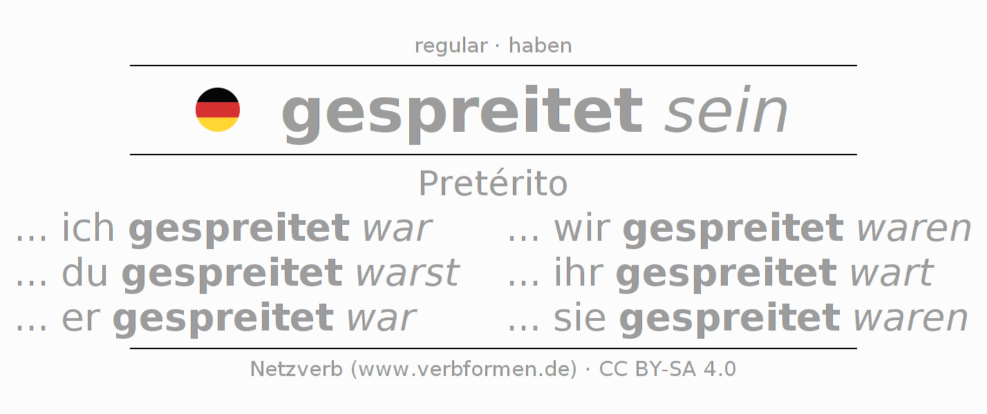 A conjugação do verbo spreiten no Estado passivo Pretérito Indicativo Pretérito é: ... ich gespreitet war, ... du gespreitet warst, ... er gespreitet war, ... wir gespreitet waren, ... ihr gespreitet wart, ... sie gespreitet waren.A formação dessas formas segue determinadas regras gramaticais. Os requisitos para a conjugação do verbo como forma verbal simples no spreiten do Pretérito. Comentários ☆