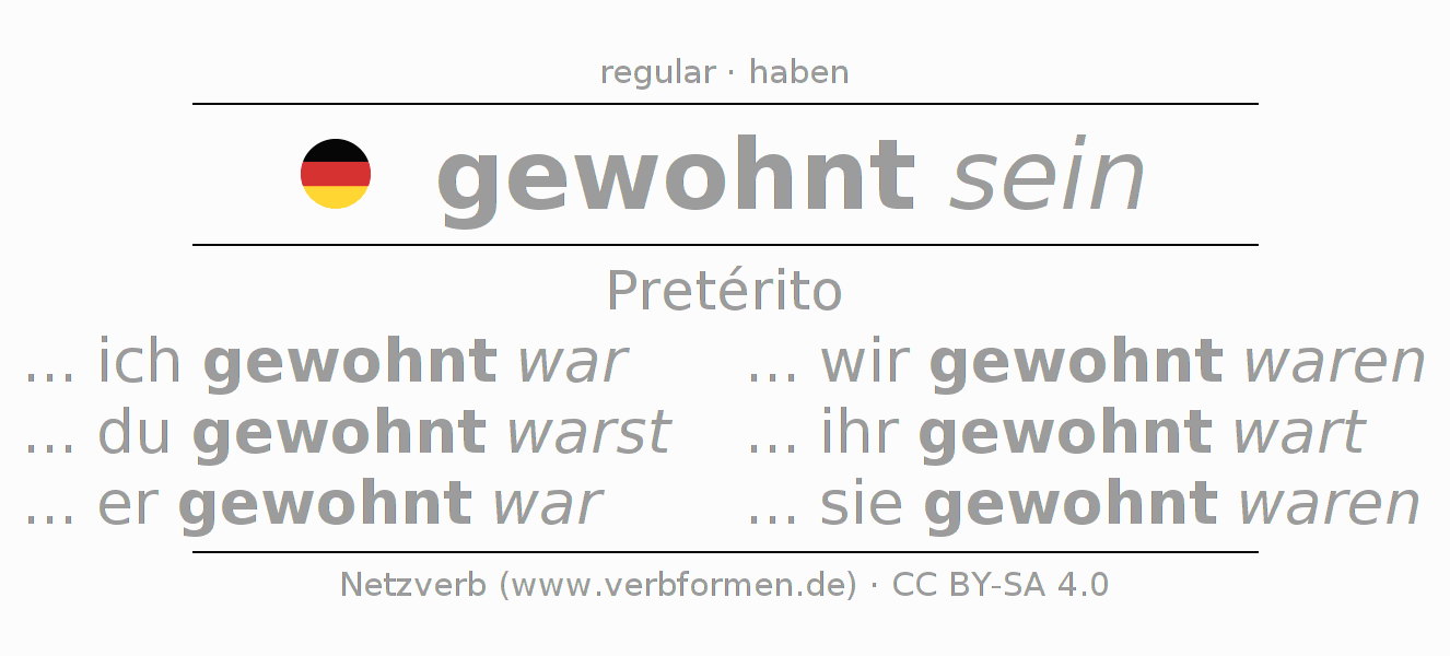 A conjugação do verbo wohnen no Estado passivo Pretérito Indicativo Pretérito é: ... ich gewohnt war, ... du gewohnt warst, ... er gewohnt war, ... wir gewohnt waren, ... ihr gewohnt wart, ... sie gewohnt waren.A formação dessas formas segue determinadas regras gramaticais. Os requisitos para a conjugação do verbo como forma verbal simples no wohnen do Pretérito. Comentários ☆