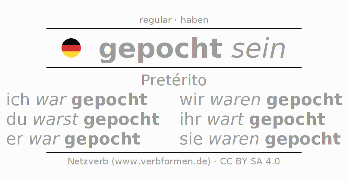 A conjugação do verbo pochen no Estado passivo Pretérito Indicativo Pretérito é: ich war gepocht, du warst gepocht, er war gepocht, wir waren gepocht, ihr wart gepocht, sie waren gepocht.A formação dessas formas segue determinadas regras gramaticais. Os requisitos para a conjugação do verbo como forma verbal simples no pochen do Pretérito. Comentários ☆