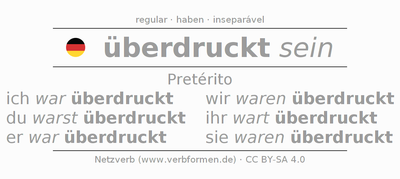 A conjugação do verbo überdrucken no Estado passivo Pretérito Indicativo Pretérito é: ich war überdruckt, du warst überdruckt, er war überdruckt, wir waren überdruckt, ihr wart überdruckt, sie waren überdruckt.A formação dessas formas segue determinadas regras gramaticais. Os requisitos para a conjugação do verbo como forma verbal simples no überdrucken do Pretérito. Comentários ☆