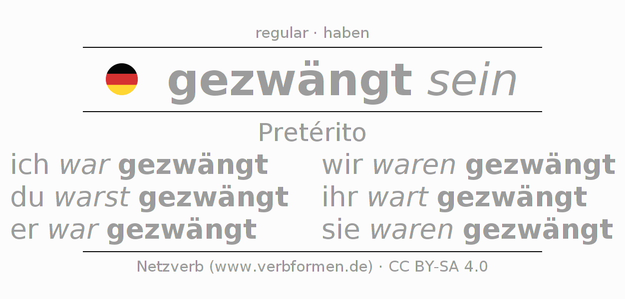 A conjugação do verbo zwängen no Estado passivo Pretérito Indicativo Pretérito é: ich war gezwängt, du warst gezwängt, er war gezwängt, wir waren gezwängt, ihr wart gezwängt, sie waren gezwängt.A formação dessas formas segue determinadas regras gramaticais. Os requisitos para a conjugação do verbo como forma verbal simples no zwängen do Pretérito. Comentários ☆