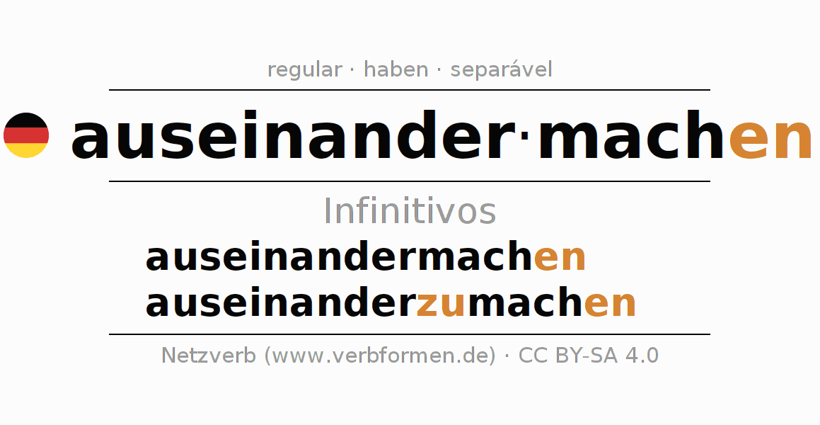 As formas do infinitivo do verbo auseinandermachen (desmontar, dispersar) são: auseinandermachen, auseinanderzumachen