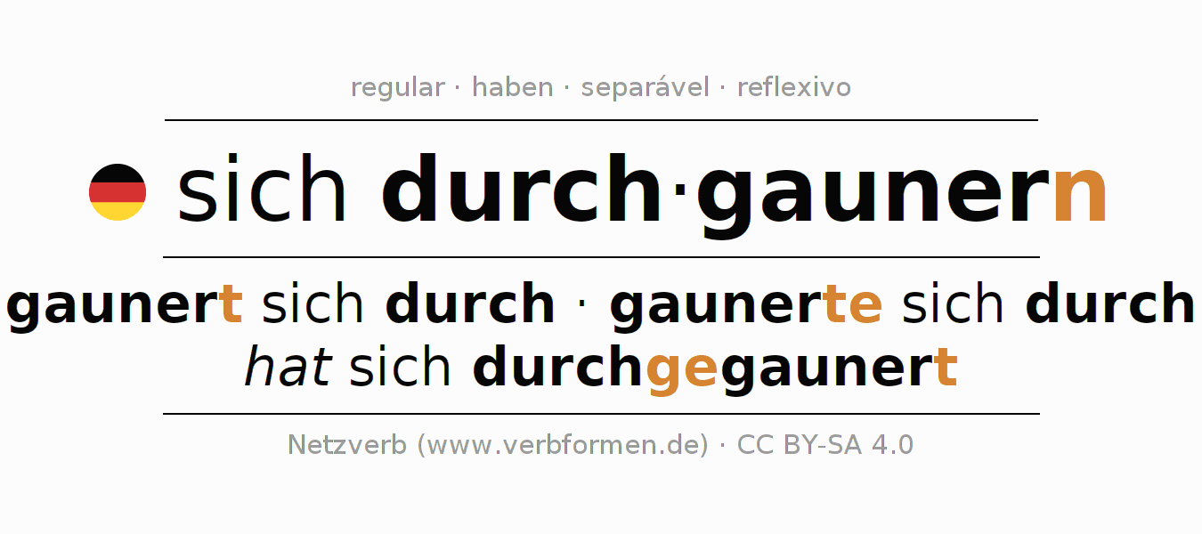 As formas do infinitivo do verbo sich durchgaunern (enganar, trapacear) são: sich durchgaunern, sich durchzugaunern