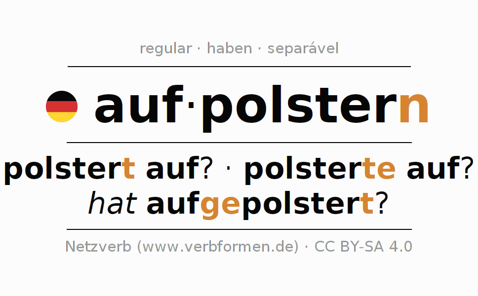 A conjugação do verbo aufpolstern no Ativo Infinitivo Presente Perfeito forma básica é: aufpolstern, aufzupolstern.A formação dessas formas segue determinadas regras gramaticais. Os requisitos para a conjugação do verbo como forma verbal simples no aufpolstern do Infinitivo. Comentários ☆