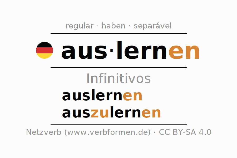 A conjugação do verbo auslernen no Ativo Infinitivo Presente Perfeito forma básica é: auslernen, auszulernen.A formação dessas formas segue determinadas regras gramaticais. Os requisitos para a conjugação do verbo como forma verbal simples no auslernen do Infinitivo. Comentários ☆