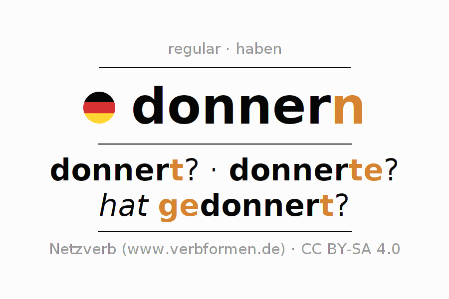 A conjugação do verbo donnern no Ativo Infinitivo Presente Perfeito forma básica é: donnern, zu donnern.A formação dessas formas segue determinadas regras gramaticais. Os requisitos para a conjugação do verbo como forma verbal simples no donnern do Infinitivo. Comentários ☆