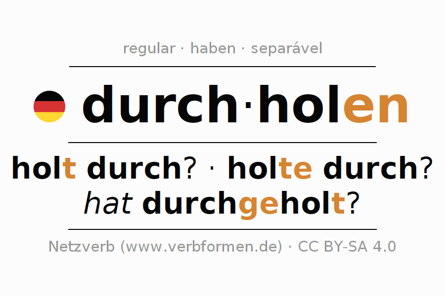 A conjugação do verbo durchholen no Ativo Infinitivo Presente Perfeito forma básica é: durchholen, durchzuholen.A formação dessas formas segue determinadas regras gramaticais. Os requisitos para a conjugação do verbo como forma verbal simples no durchholen do Infinitivo. Comentários ☆