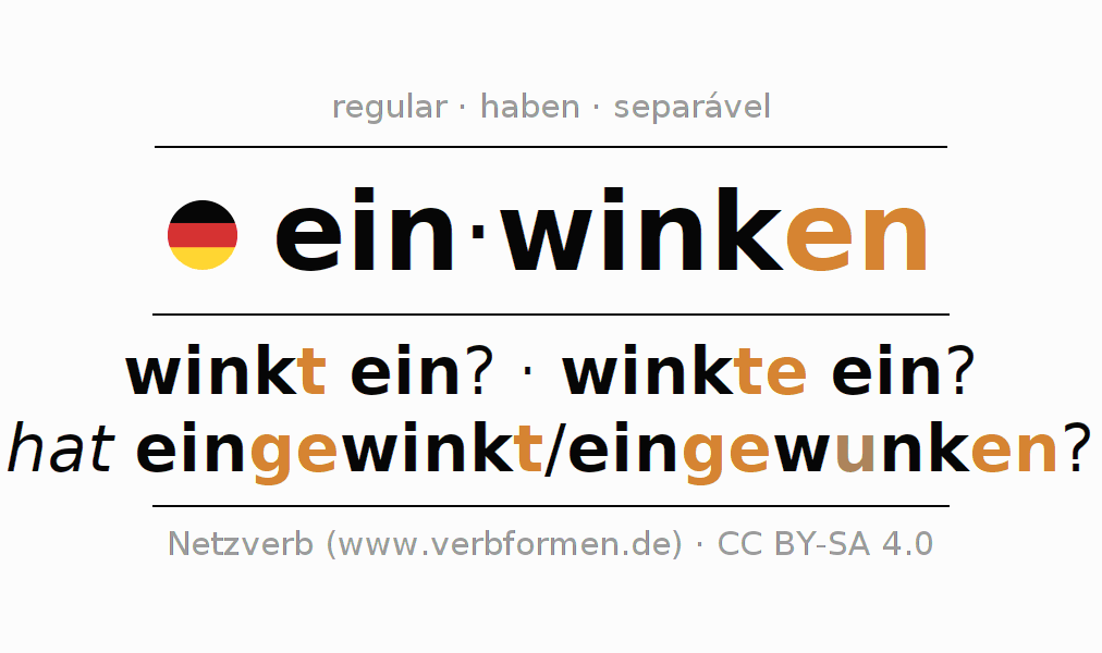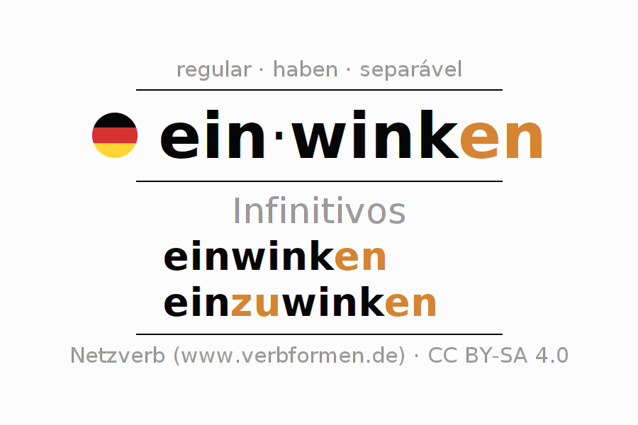 A conjugação do verbo einwinken no Ativo Infinitivo Presente Perfeito forma básica é: einwinken, einzuwinken.A formação dessas formas segue determinadas regras gramaticais. Os requisitos para a conjugação do verbo como forma verbal simples no einwinken do Infinitivo. Comentários ☆