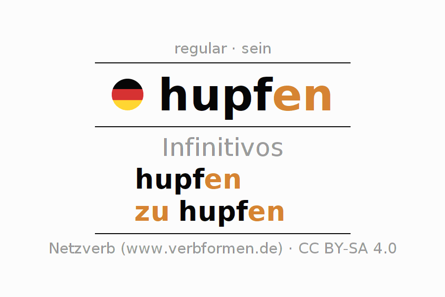 A conjugação do verbo hupfen no Ativo Infinitivo Presente Perfeito forma básica é: hupfen, zu hupfen.A formação dessas formas segue determinadas regras gramaticais. Os requisitos para a conjugação do verbo como forma verbal simples no hupfen do Infinitivo. Comentários ☆