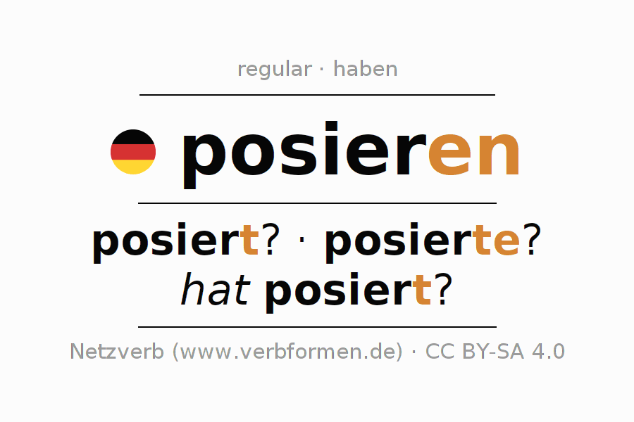 A conjugação do verbo posieren no Ativo Infinitivo Presente Perfeito forma básica é: posieren, zu posieren.A formação dessas formas segue determinadas regras gramaticais. Os requisitos para a conjugação do verbo como forma verbal simples no posieren do Infinitivo. Comentários ☆