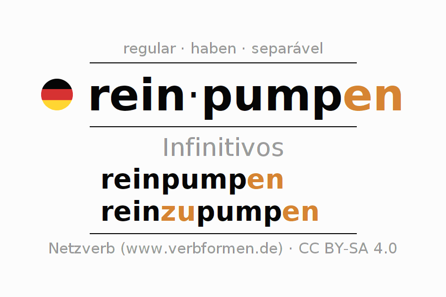 A conjugação do verbo reinpumpen no Ativo Infinitivo Presente Perfeito forma básica é: reinpumpen, reinzupumpen.A formação dessas formas segue determinadas regras gramaticais. Os requisitos para a conjugação do verbo como forma verbal simples no reinpumpen do Infinitivo. Comentários ☆