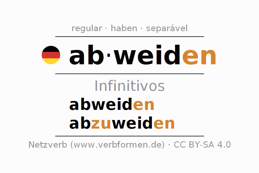A conjugação do verbo abweiden no Ativo Infinitivo Presente Perfeito forma básica é: abweiden, abzuweiden.A formação dessas formas segue determinadas regras gramaticais. Os requisitos para a conjugação do verbo como forma verbal simples no abweiden do Infinitivo. Comentários ☆