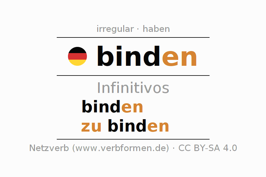 A conjugação do verbo binden no Ativo Infinitivo Presente Perfeito forma básica é: binden, zu binden.A formação dessas formas segue determinadas regras gramaticais. Os requisitos para a conjugação do verbo como forma verbal simples no binden do Infinitivo. Comentários ☆