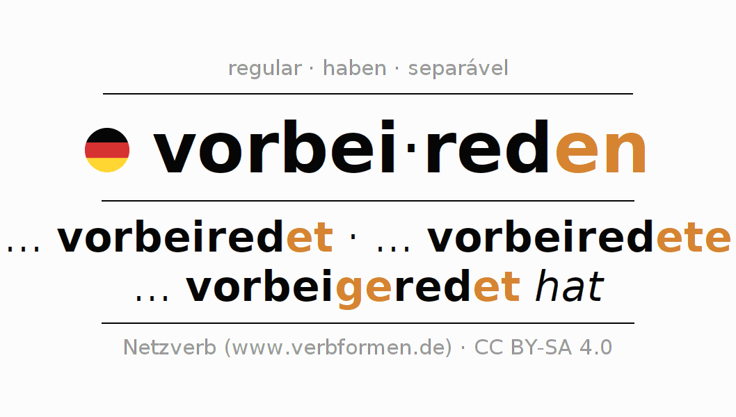 A conjugação do verbo vorbeireden no Ativo Infinitivo Presente Perfeito forma básica é: vorbeireden, vorbeizureden.A formação dessas formas segue determinadas regras gramaticais. Os requisitos para a conjugação do verbo como forma verbal simples no vorbeireden do Infinitivo. Comentários ☆
