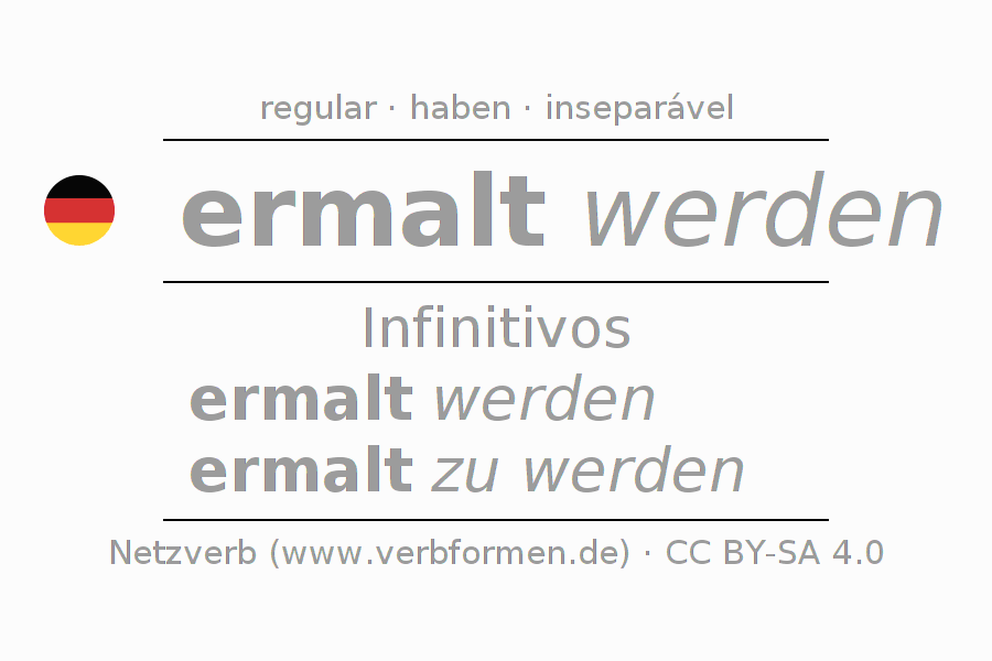 A conjugação do verbo ermalen no Voz Passiva Infinitivo Presente Perfeito forma básica é: ermalt werden, ermalt zu werden.A formação dessas formas segue determinadas regras gramaticais. Os requisitos para a conjugação do verbo como forma verbal simples no ermalen do Infinitivo. Comentários ☆