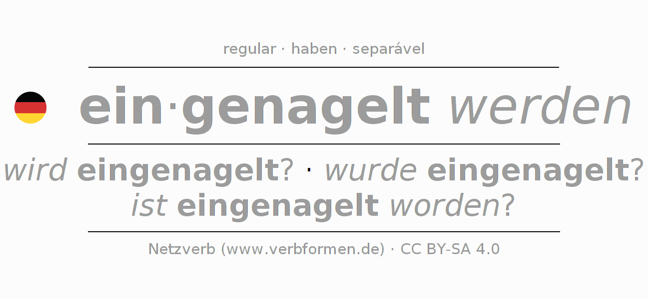 A conjugação do verbo einnageln no Voz Passiva Infinitivo Presente Perfeito forma básica é: eingenagelt werden, eingenagelt zu werden.A formação dessas formas segue determinadas regras gramaticais. Os requisitos para a conjugação do verbo como forma verbal simples no einnageln do Infinitivo. Comentários ☆