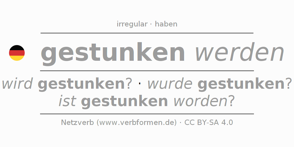 A conjugação do verbo stinken no Voz Passiva Infinitivo Presente Perfeito forma básica é: gestunken werden, gestunken zu werden.A formação dessas formas segue determinadas regras gramaticais. Os requisitos para a conjugação do verbo como forma verbal simples no stinken do Infinitivo. Comentários ☆