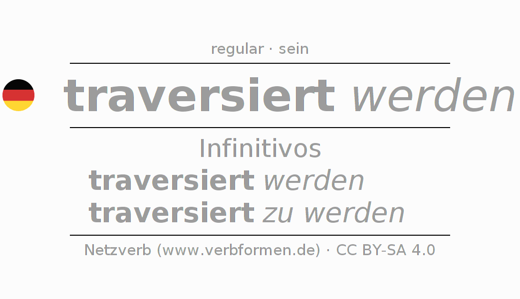A conjugação do verbo traversieren no Voz Passiva Infinitivo Presente Perfeito forma básica é: traversiert werden, traversiert zu werden.A formação dessas formas segue determinadas regras gramaticais. Os requisitos para a conjugação do verbo como forma verbal simples no traversieren do Infinitivo. Comentários ☆