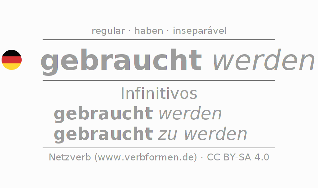A conjugação do verbo gebrauchen no Voz Passiva Infinitivo Presente Perfeito forma básica é: gebraucht werden, gebraucht zu werden.A formação dessas formas segue determinadas regras gramaticais. Os requisitos para a conjugação do verbo como forma verbal simples no gebrauchen do Infinitivo. Comentários ☆