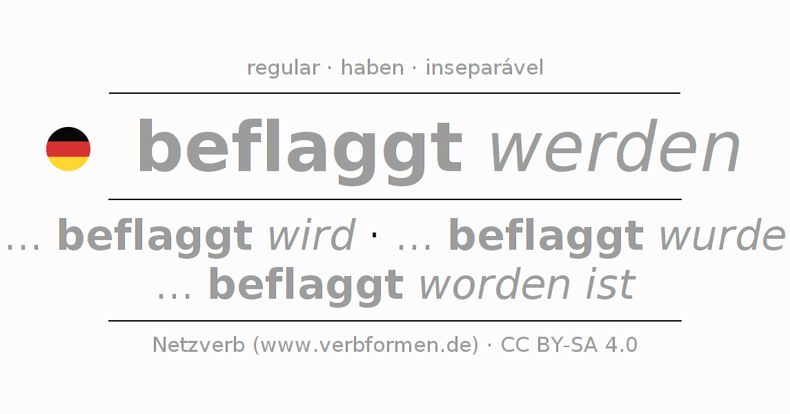 A conjugação do verbo beflaggen no Voz Passiva Infinitivo Presente Perfeito forma básica é: beflaggt werden, beflaggt zu werden.A formação dessas formas segue determinadas regras gramaticais. Os requisitos para a conjugação do verbo como forma verbal simples no beflaggen do Infinitivo. Comentários ☆
