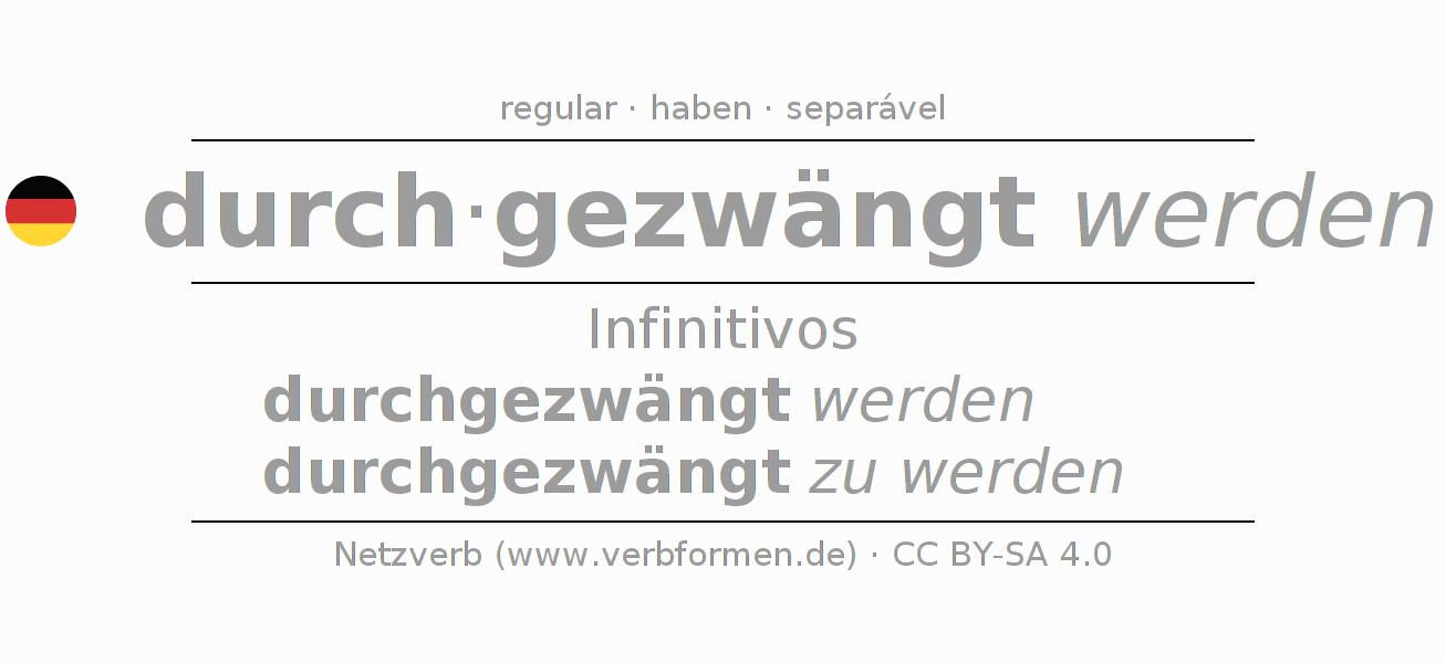 A conjugação do verbo durchzwängen no Voz Passiva Infinitivo Presente Perfeito forma básica é: durchgezwängt werden, durchgezwängt zu werden.A formação dessas formas segue determinadas regras gramaticais. Os requisitos para a conjugação do verbo como forma verbal simples no durchzwängen do Infinitivo. Comentários ☆