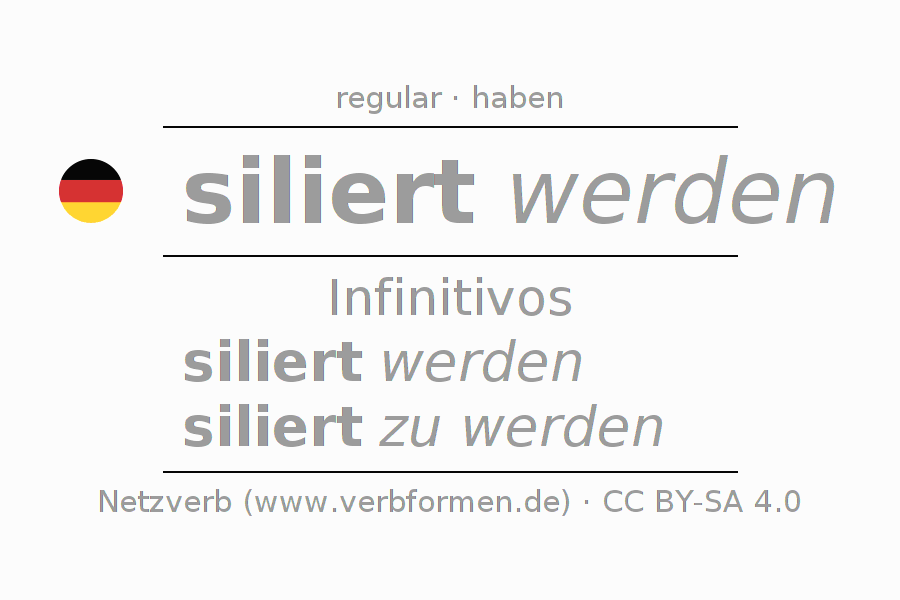 A conjugação do verbo silieren no Voz Passiva Infinitivo Presente Perfeito forma básica é: siliert werden, siliert zu werden.A formação dessas formas segue determinadas regras gramaticais. Os requisitos para a conjugação do verbo como forma verbal simples no silieren do Infinitivo. Comentários ☆