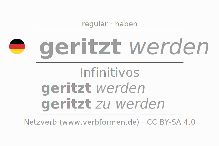 A conjugação do verbo ritzen no Voz Passiva Infinitivo Presente Perfeito forma básica é: geritzt werden, geritzt zu werden.A formação dessas formas segue determinadas regras gramaticais. Os requisitos para a conjugação do verbo como forma verbal simples no ritzen do Infinitivo. Comentários ☆
