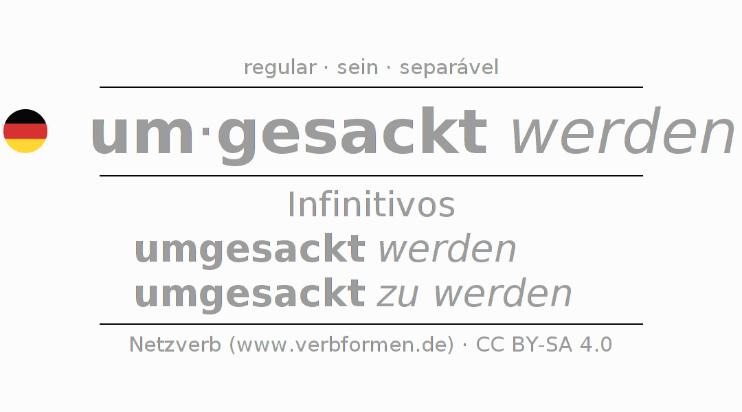 A conjugação do verbo umsacken no Voz Passiva Infinitivo Presente Perfeito forma básica é: umgesackt werden, umgesackt zu werden.A formação dessas formas segue determinadas regras gramaticais. Os requisitos para a conjugação do verbo como forma verbal simples no umsacken do Infinitivo. Comentários ☆
