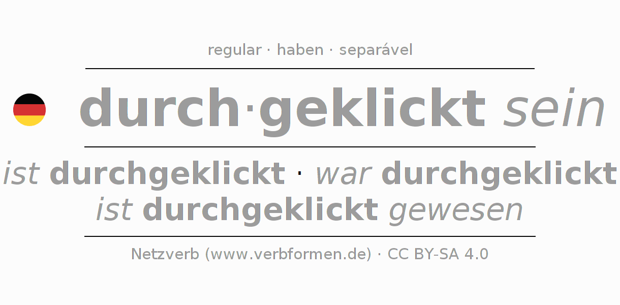 A conjugação do verbo durchklicken no Estado passivo Infinitivo Presente Perfeito forma básica é: durchgeklickt sein, durchgeklickt zu sein.A formação dessas formas segue determinadas regras gramaticais. Os requisitos para a conjugação do verbo como forma verbal simples no durchklicken do Infinitivo. Comentários ☆