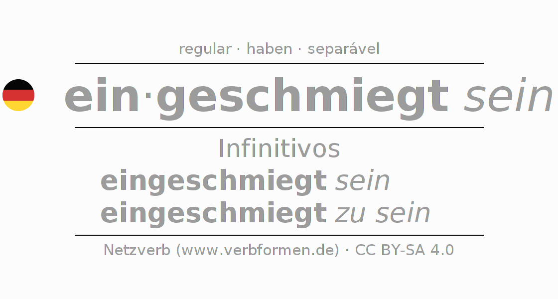 A conjugação do verbo einschmiegen no Estado passivo Infinitivo Presente Perfeito forma básica é: eingeschmiegt sein, eingeschmiegt zu sein.A formação dessas formas segue determinadas regras gramaticais. Os requisitos para a conjugação do verbo como forma verbal simples no einschmiegen do Infinitivo. Comentários ☆