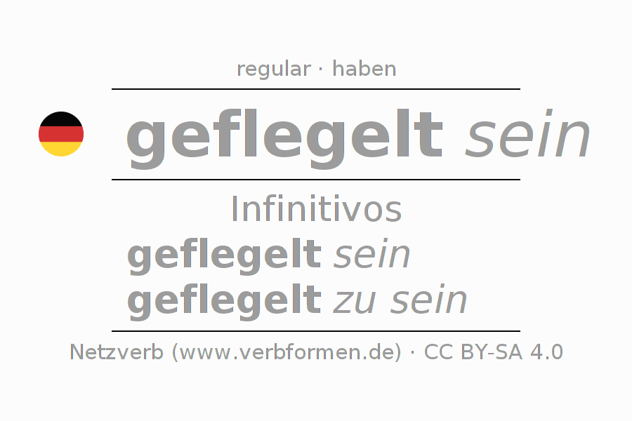 A conjugação do verbo flegeln no Estado passivo Infinitivo Presente Perfeito forma básica é: geflegelt sein, geflegelt zu sein.A formação dessas formas segue determinadas regras gramaticais. Os requisitos para a conjugação do verbo como forma verbal simples no flegeln do Infinitivo. Comentários ☆