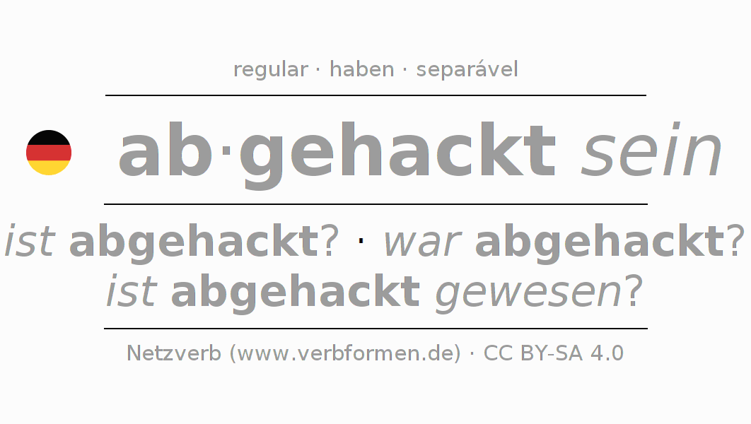 A conjugação do verbo abhacken no Estado passivo Infinitivo Presente Perfeito forma básica é: abgehackt sein, abgehackt zu sein.A formação dessas formas segue determinadas regras gramaticais. Os requisitos para a conjugação do verbo como forma verbal simples no abhacken do Infinitivo. Comentários ☆