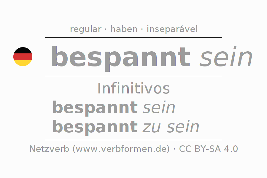 A conjugação do verbo bespannen no Estado passivo Infinitivo Presente Perfeito forma básica é: bespannt sein, bespannt zu sein.A formação dessas formas segue determinadas regras gramaticais. Os requisitos para a conjugação do verbo como forma verbal simples no bespannen do Infinitivo. Comentários ☆