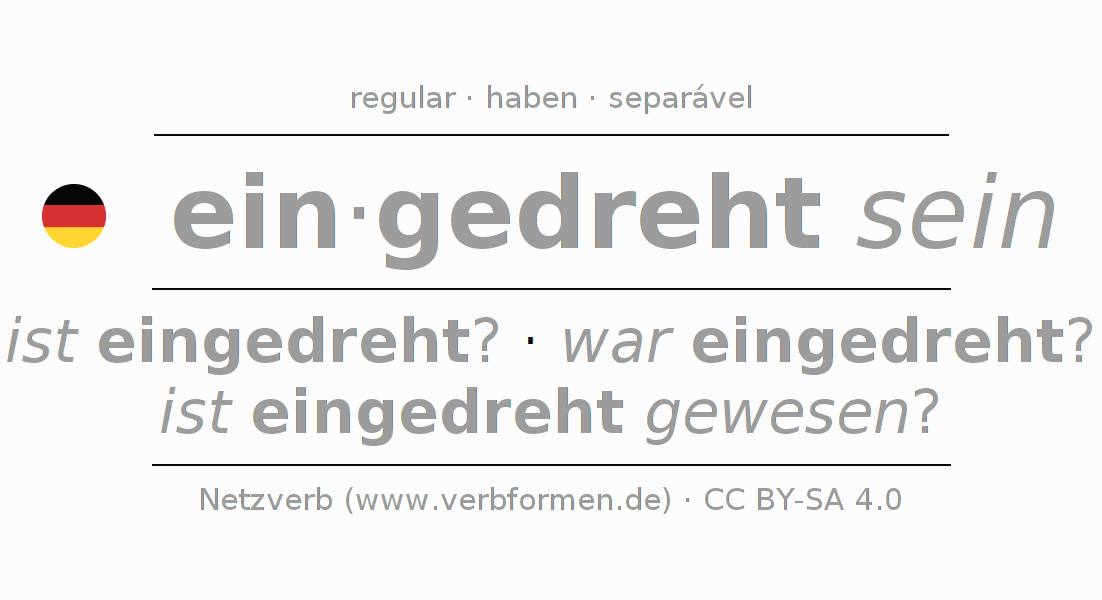 A conjugação do verbo eindrehen no Estado passivo Infinitivo Presente Perfeito forma básica é: eingedreht sein, eingedreht zu sein.A formação dessas formas segue determinadas regras gramaticais. Os requisitos para a conjugação do verbo como forma verbal simples no eindrehen do Infinitivo. Comentários ☆