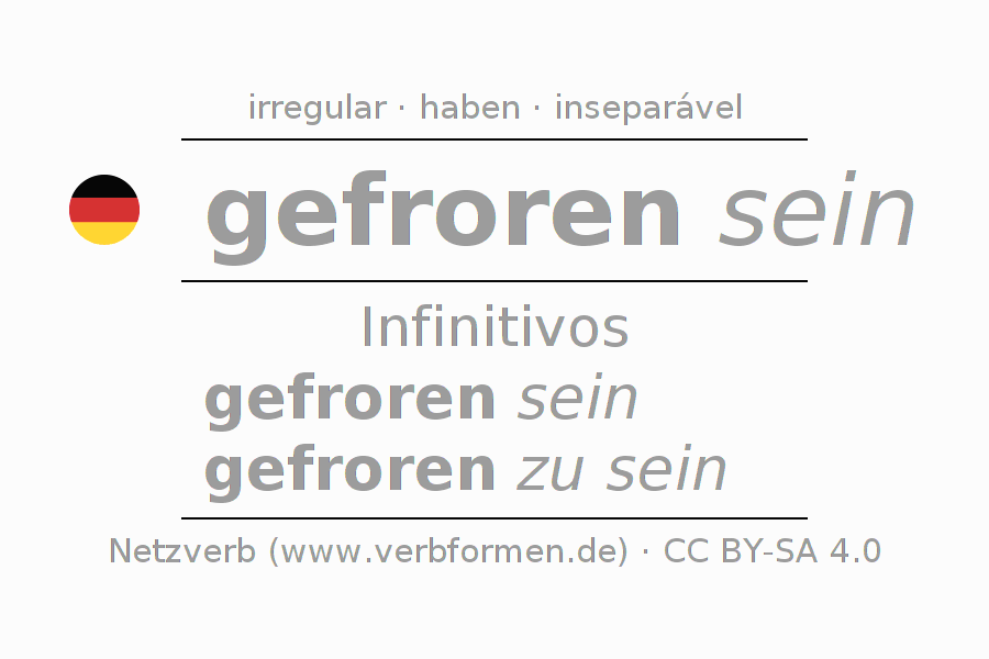 A conjugação do verbo gefrieren no Estado passivo Infinitivo Presente Perfeito forma básica é: gefroren sein, gefroren zu sein.A formação dessas formas segue determinadas regras gramaticais. Os requisitos para a conjugação do verbo como forma verbal simples no gefrieren do Infinitivo. Comentários ☆
