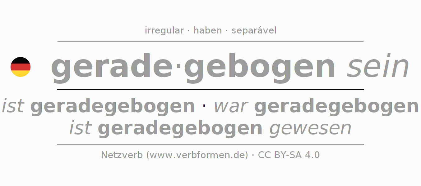 A conjugação do verbo geradebiegen no Estado passivo Infinitivo Presente Perfeito forma básica é: geradegebogen sein, geradegebogen zu sein.A formação dessas formas segue determinadas regras gramaticais. Os requisitos para a conjugação do verbo como forma verbal simples no geradebiegen do Infinitivo. Comentários ☆