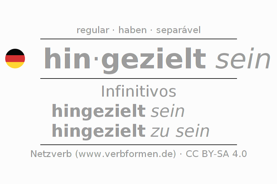 A conjugação do verbo hinzielen no Estado passivo Infinitivo Presente Perfeito forma básica é: hingezielt sein, hingezielt zu sein.A formação dessas formas segue determinadas regras gramaticais. Os requisitos para a conjugação do verbo como forma verbal simples no hinzielen do Infinitivo. Comentários ☆