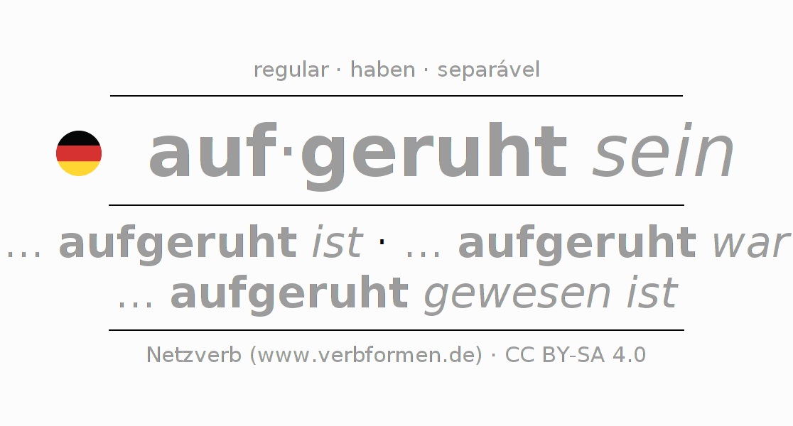A conjugação do verbo aufruhen no Estado passivo Infinitivo Presente Perfeito forma básica é: aufgeruht sein, aufgeruht zu sein.A formação dessas formas segue determinadas regras gramaticais. Os requisitos para a conjugação do verbo como forma verbal simples no aufruhen do Infinitivo. Comentários ☆
