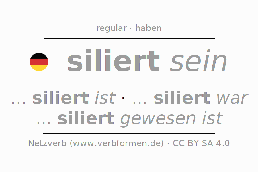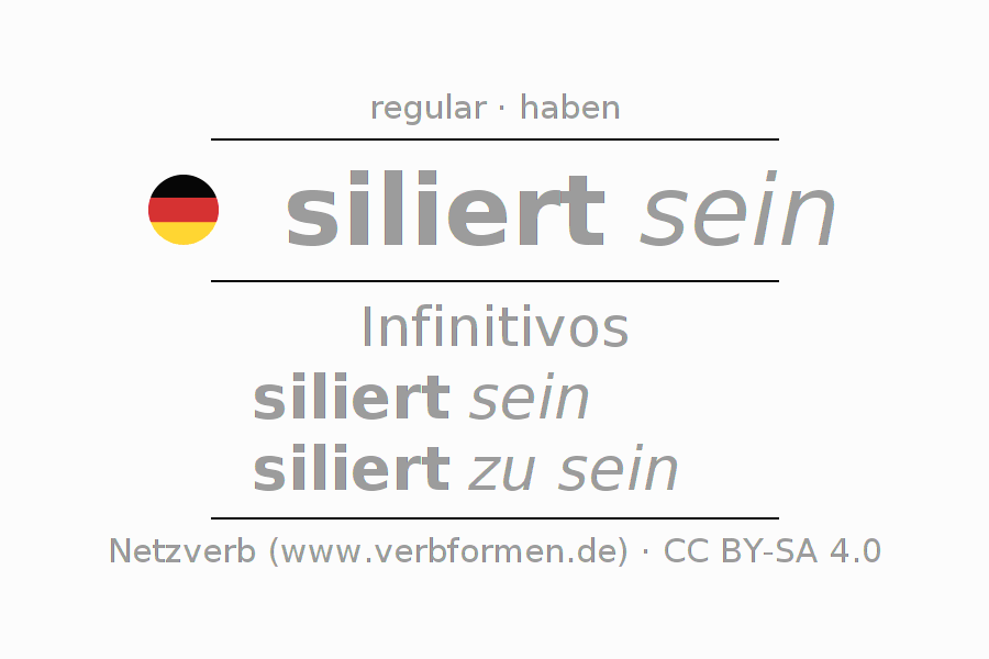 A conjugação do verbo silieren no Estado passivo Infinitivo Presente Perfeito forma básica é: siliert sein, siliert zu sein.A formação dessas formas segue determinadas regras gramaticais. Os requisitos para a conjugação do verbo como forma verbal simples no silieren do Infinitivo. Comentários ☆
