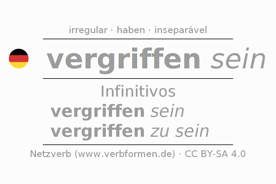 A conjugação do verbo vergreifen no Estado passivo Infinitivo Presente Perfeito forma básica é: vergriffen sein, vergriffen zu sein.A formação dessas formas segue determinadas regras gramaticais. Os requisitos para a conjugação do verbo como forma verbal simples no vergreifen do Infinitivo. Comentários ☆