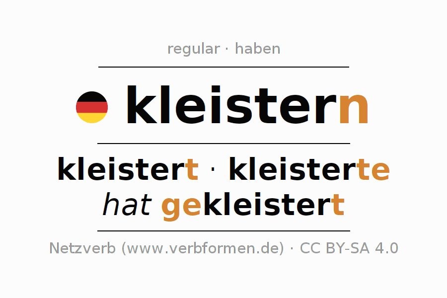 A conjugação do verbo kleistern (colar, fixar) é regular. As formas mais comuns são kleistert, kleisterte e hat gekleistert. O verbo auxilar para kleistern é "haben".