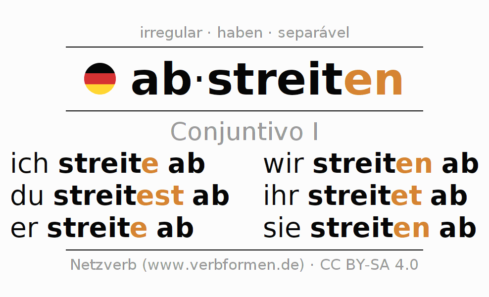 As formas de conjugação do verbo abstreiten (negar, contestar) no conjuntivo I são: ich streite ab, du streitest ab, er streite ab, wir streiten ab, ihr streitet ab, sie streiten ab