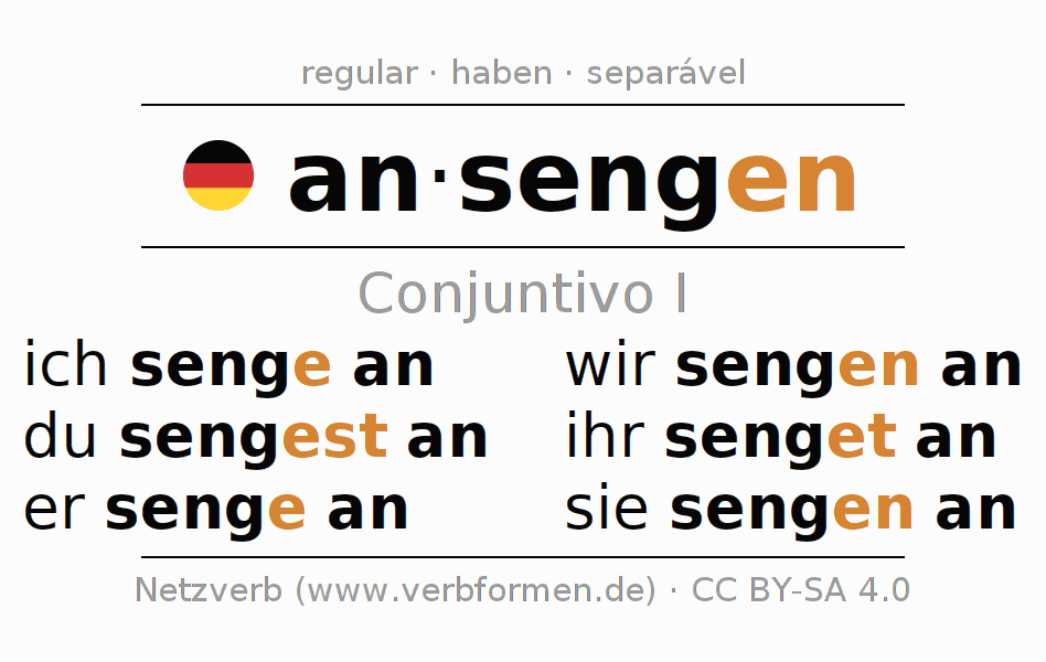 As formas de conjugação do verbo ansengen (chamuscar, queimar superficialmente) no conjuntivo I são: ich senge an, du sengest an, er senge an, wir sengen an, ihr senget an, sie sengen an