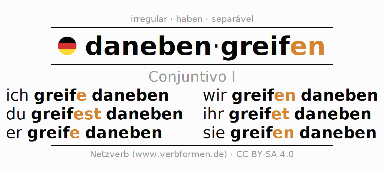 As formas de conjugação do verbo danebengreifen (errar, falhar) no conjuntivo I são: ich greife daneben, du greifest daneben, er greife daneben, wir greifen daneben, ihr greifet daneben, sie greifen daneben