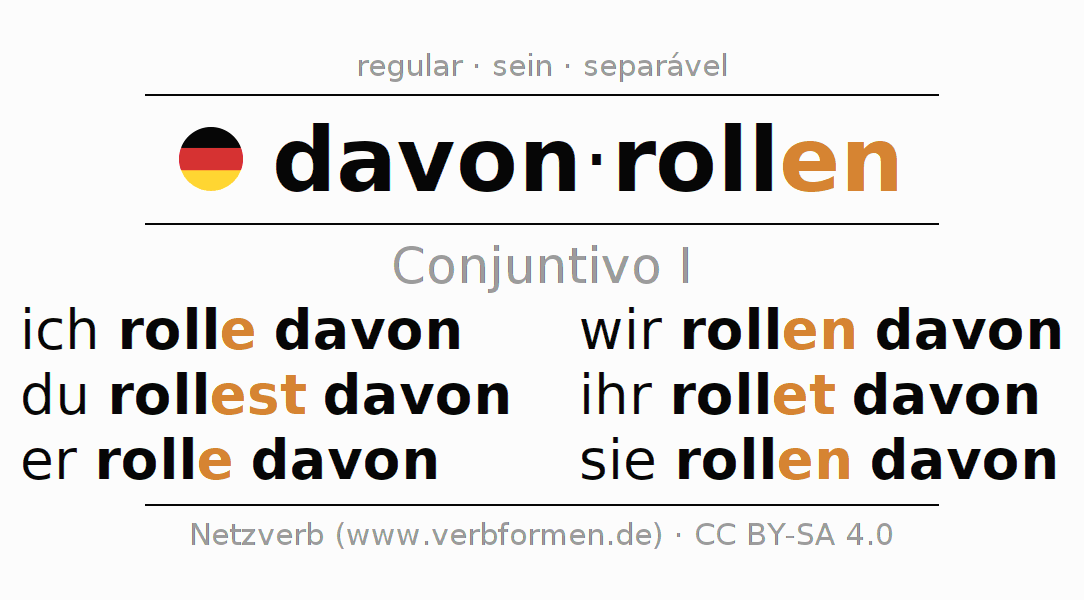 As formas de conjugação do verbo davonrollen (rolar para longe) no conjuntivo I são: ich rolle davon, du rollest davon, er rolle davon, wir rollen davon, ihr rollet davon, sie rollen davon