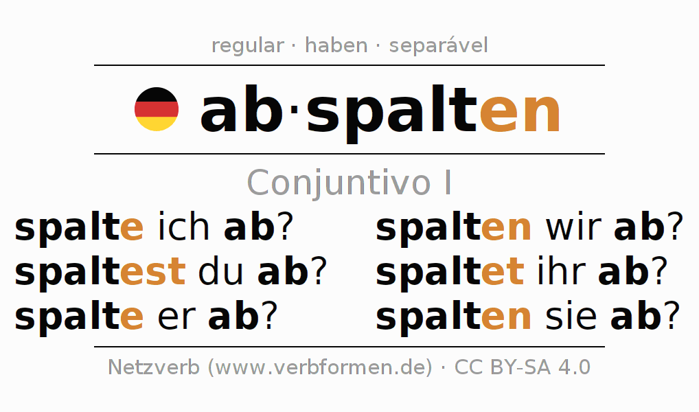 A conjugação do verbo abspalten no Ativo Conjuntivo Presente Conjuntivo é: spalte ich ab?, spaltest du ab?, spalte er ab?, spalten wir ab?, spaltet ihr ab?, spalten sie ab?.A formação dessas formas segue determinadas regras gramaticais. Os requisitos para a conjugação do verbo como forma verbal simples no abspalten do Conjuntivo I. Comentários ☆