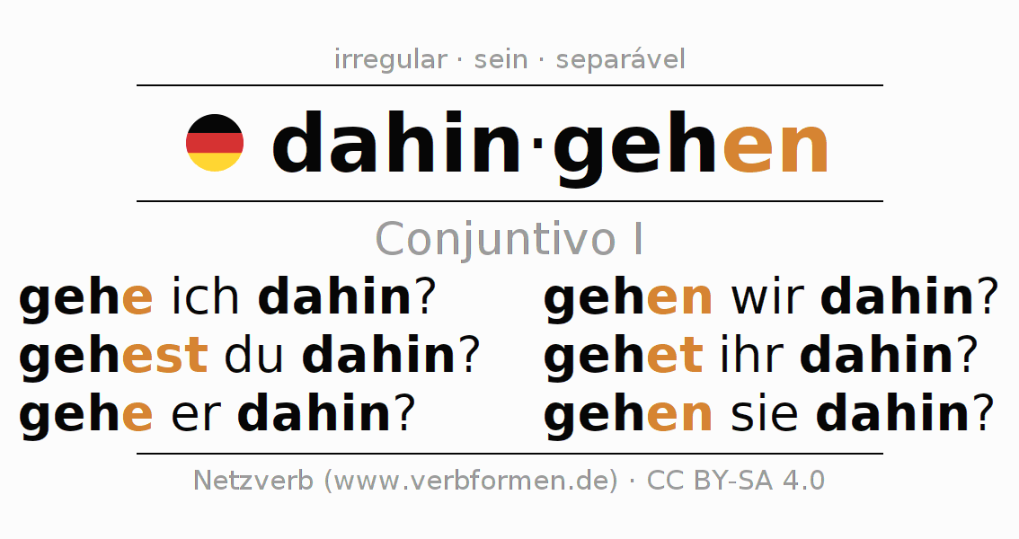 A conjugação do verbo dahingehen no Ativo Conjuntivo Presente Conjuntivo é: gehe ich dahin?, gehest du dahin?, gehe er dahin?, gehen wir dahin?, gehet ihr dahin?, gehen sie dahin?.A formação dessas formas segue determinadas regras gramaticais. Os requisitos para a conjugação do verbo como forma verbal simples no dahingehen do Conjuntivo I. Comentários ☆